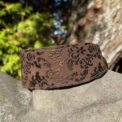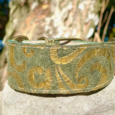Elegancka oliwkowa obroża dla chartów z florystyczną taśmą. Szeroka, wygodna i stylowa – idealna dla smukłych, szlachetnych psów