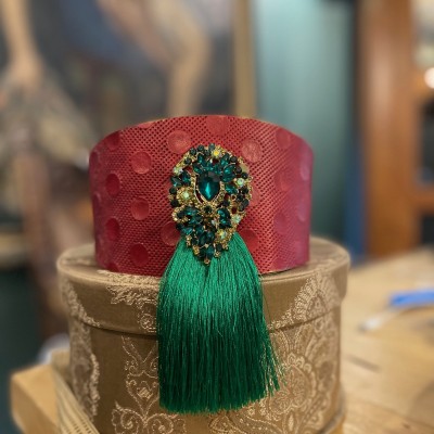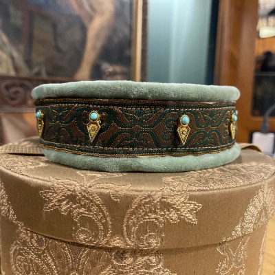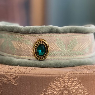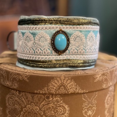 Obroża na seledynowym welurze zdobiona haftowaną taśma orientalną i elementami biżuterii