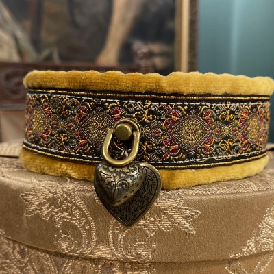 Obroża wykonana na złotym welurze ,obszyta piękna ,haftowaną masą w stylu orientalnym,piekny moszny wisiorek na przodzie
