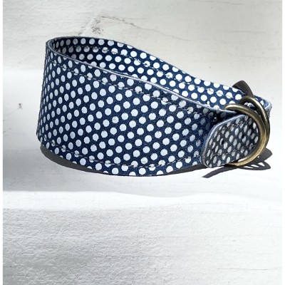 Stylowa obroża z matowej włoskiej skóry błękitnej w białe groszki. Ręcznie wykonana, z okuciami stare złoto. Dostępna tylko w wybranych rozmiarach – sprawdź już teraz