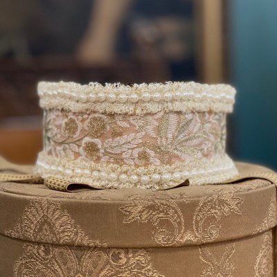 Obroża w jasnych odcieniach ,haftowana złotą nitką, zdobiona perełkami