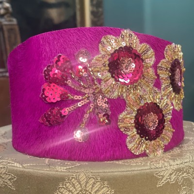 Obroża wykonana z włoskiej skóry z delikatnym włosem ,w najmodniejszym kolorze w tym sezonie, dekorowana ręcznie cekinami