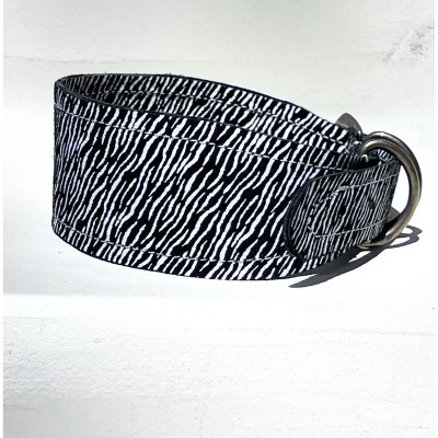 Obroża dla psa z naturalnej skóry z włosem w biało-czarne tygrysie cętki. Ręczne wykonanie, okucia stare złoto. Dostępna w wybranych rozmiarach – sprawdź teraz!