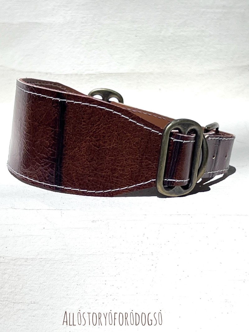 Obroża z lakierowanej skóry w kolorze czekoladowym, z okuciami w starym złocie. Klasyka i styl premium. Dostępna w wybranych rozmiarach – sprawdź!