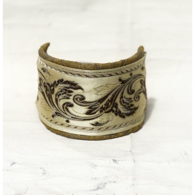 Bazą jest wysokiej jakości oliwkowy żakard – tkanina o subtelnej fakturze i głębokim, naturalnym odcieniu. Na nim została naszyta efektowna taśma w roślinne, florystyczne wzory, które dodają całości delikatnego, artystycznego charakteru.