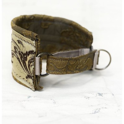 Elegancka oliwkowa obroża dla chartów z florystyczną taśmą. Szeroka, wygodna i stylowa – idealna dla smukłych, szlachetnych psów
