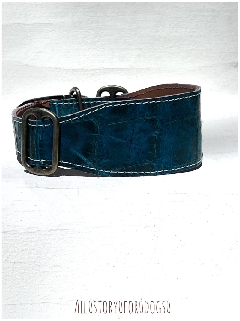 Luksusowa i stylowa obroża dla psa z włoskiej lakierowanej skóry w wyjątkowym kolorze ciemnego turkusu. Ręcznie wykonana, z trwałymi okuciami w kolorze starego złota, zachwyca nie tylko wyglądem, ale i jakością wykonania. To idealny wybór dla wymagających właścicieli i ich psów.