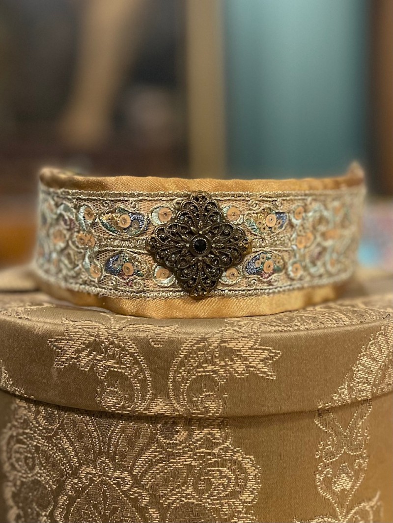 Obroża w wykonana z atłasu ,naszyta pięknie zdobiona orientalna taśma,na przodzie unikatowy medalion