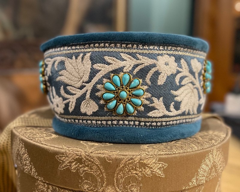 Obroża wykonana z weluru ,dekorowana piękna haftowana taśmą i turkusami