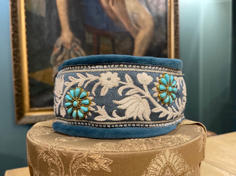 Obroża wykonana z weluru ,dekorowana piękna haftowana taśmą i turkusami