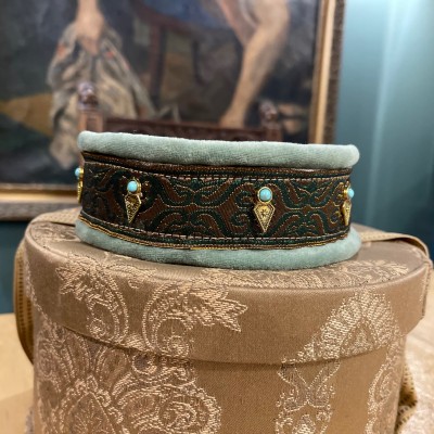 Obroża na seledynowym welurze zdobiona haftowaną taśma orientalną i elementami biżuterii