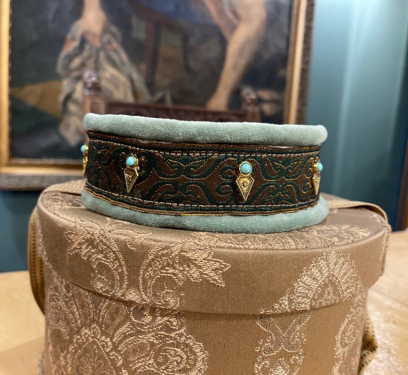 Obroża na seledynowym welurze zdobiona haftowaną taśma orientalną i elementami biżuterii