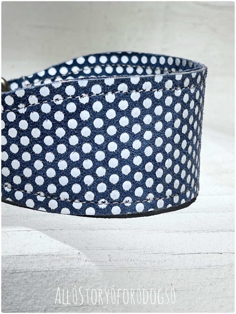 Stylowa obroża z matowej włoskiej skóry błękitnej w białe groszki. Ręcznie wykonana, z okuciami stare złoto. Dostępna tylko w wybranych rozmiarach – sprawdź już teraz