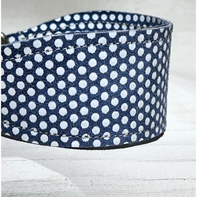 Unikalna i pełna uroku obroża dla psa z włoskiej matowej skóry naturalnej w jasnym, błękitnym kolorze z subtelnym wzorem białych groszków. Lekka i stylowa, zaprojektowana z myślą o właścicielach, którzy kochają detale i oryginalny design.