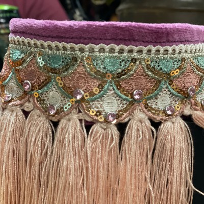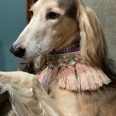 Obroża dla charta na welurze, ozdobiona cekinową, orientalną tasmą i chwostami
